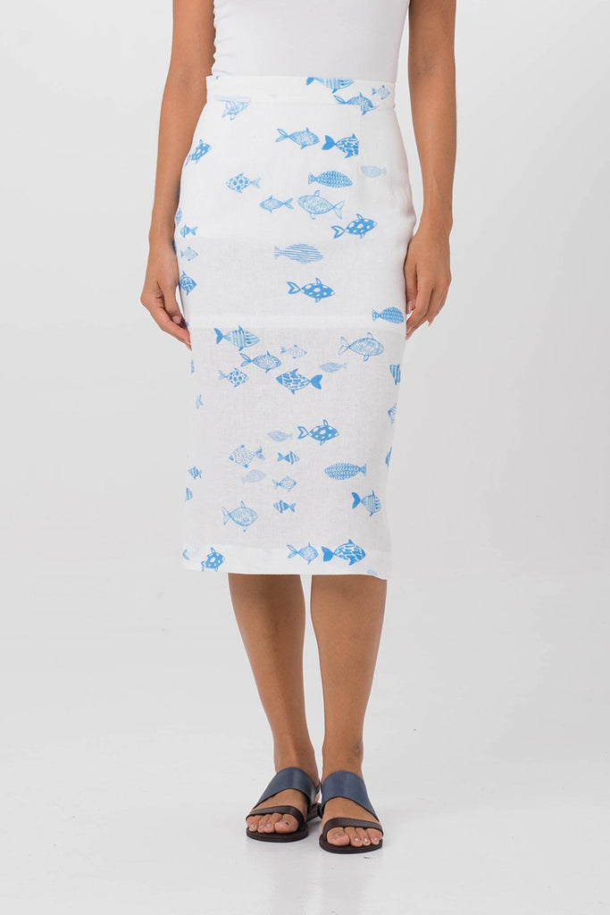 The Saint Lucia Midi Skirt is made from 100% Linen. This high waisted pencil skirt features a cotton lining, slim fit and inspired by Bali tropical fish. Unearth your classic elegance with this timeless skirt, you can pair it with our basic tank top or linen crop top.