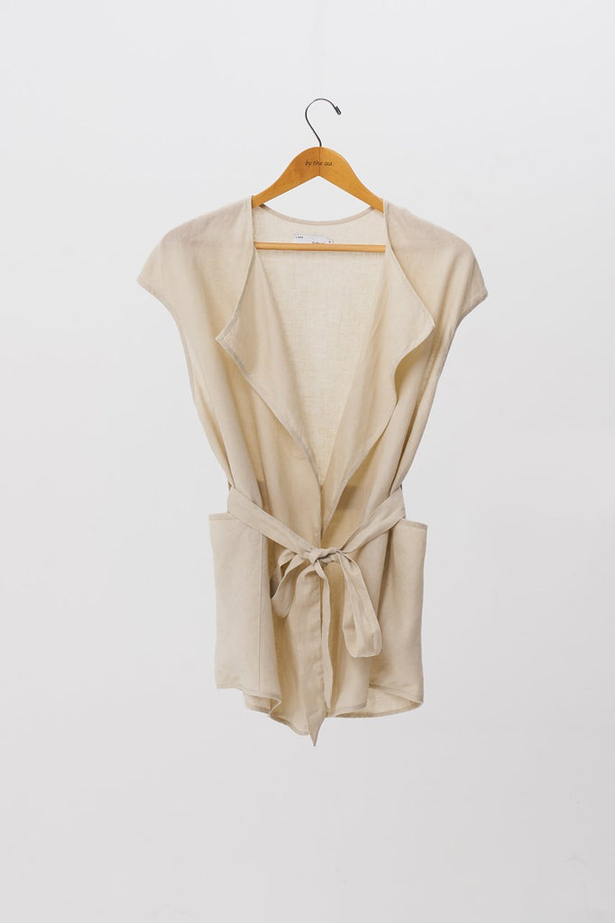 The Summer Outer is made from 100% linen. This sleeveless jacket features Deep V neckline, a collar, belt waist detail and a regular fit. This Summer outer is perfect for balmy days or chilly nights in the summer, and you can still look trendy and elegant by wearing with our basic tank top underneath and linen short or pants.