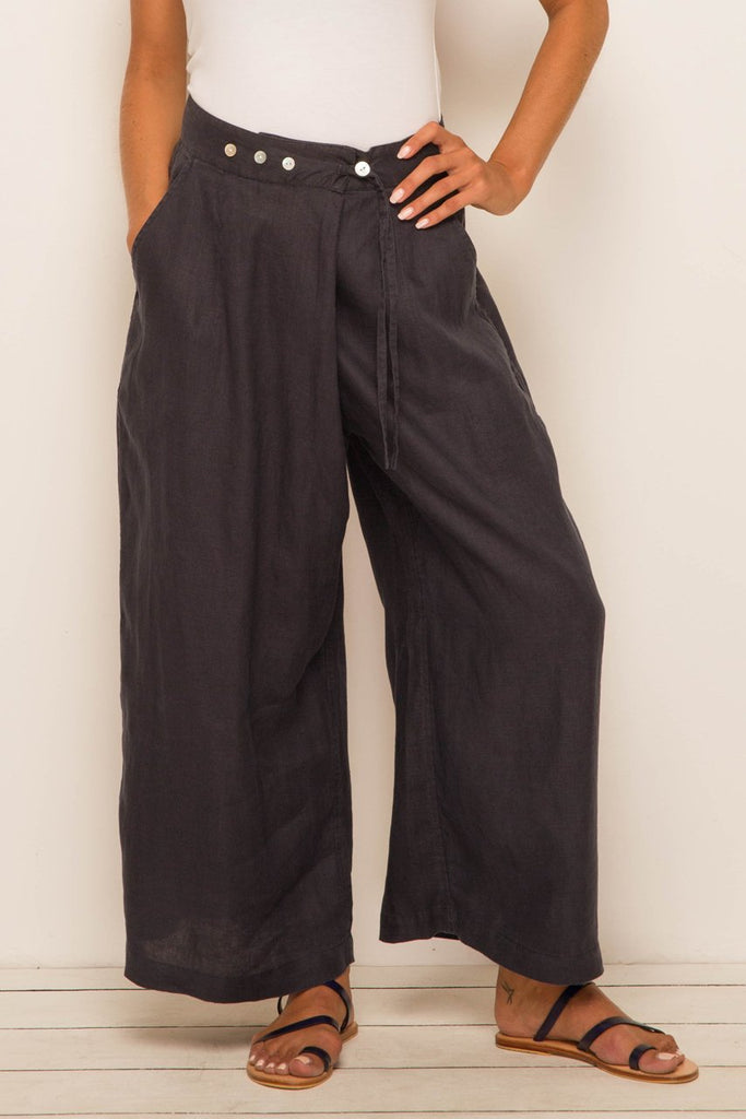 The wrap pants made from 100% linen. This high waisted pants features side pockets, front shell buttons closure and Loose fit. Easy breezy look perfect for the summer, you can pair it with our crop top, basic tank top or tube top.